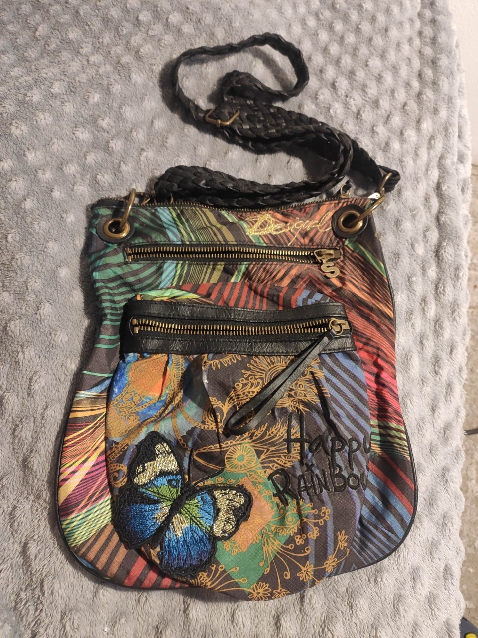 Женская сумка кроссбоди Desigual — оригинальный стиль и яркие краски! Цветная, с вышивкой бабочки и надписью Happy Rainbow 🌈 Фирменный дизайн от Desigual, Испания. Два внешних кармана на молнии, плетёный регулируемый ремешок. Состояние отличное, без повреждений. 💰 Цена:2000 дин 📍 Локация: Нови Сад, центр Подробности