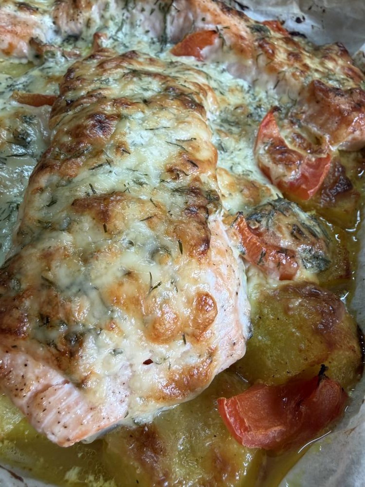 Красная рыбка с картофелем под сырной шубкой 🧀